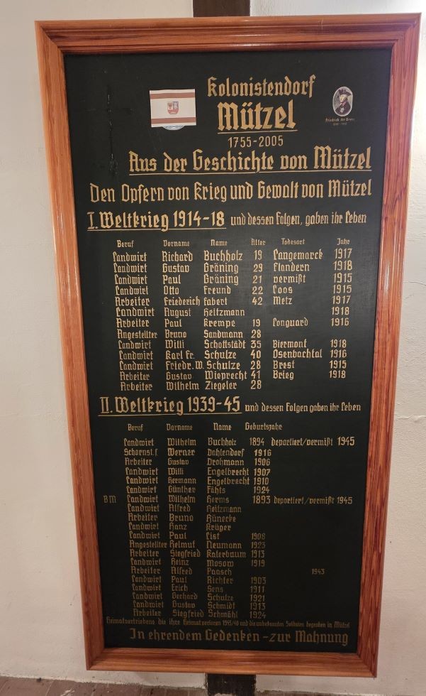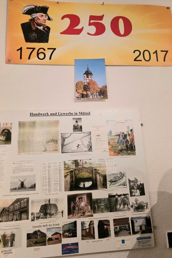Mützel wurde 1754 auf Anordnung von König Friedrich II. von Preußen gegründet. Damals lebten lediglich zwei Torfstecherfamilien im neuen Dorf. Heute zählt Mützel 598 Einwohner – eine eindrucksvolle Entwicklung, die in der Heimatstube anschaulich dokumentiert wird.